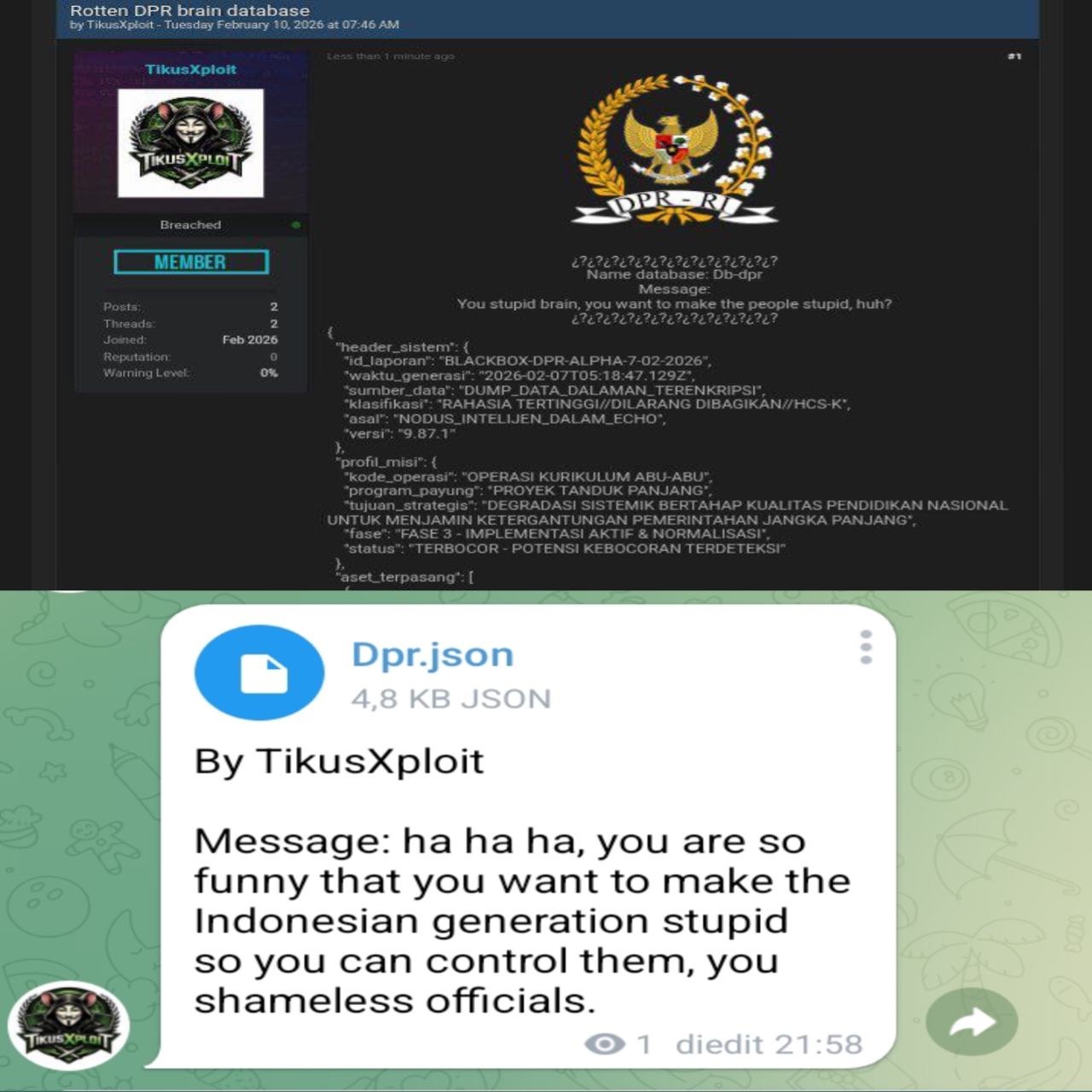 Dalam bagian insiden kompromi, disebutkan bahwa dokumen ini diakses dari sistem dpr.go.id pada 7 Februari 2026. Metode yang digunakan mencakup akses fisik saat tidak terjaga hingga ekstraksi data dari sistem backend.